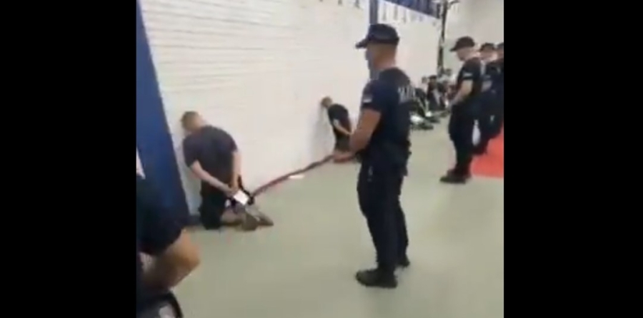 Kako se može vidjeti na snimku, više od desetak muškaraca kleči, okrenuti su ka zidu, sa lisicama na rukama. Svaki od privednih ima svog „čuvara“. Naime, po jedan pripadnik Interventne jedinice stoji iza svakog od uhapšenih.