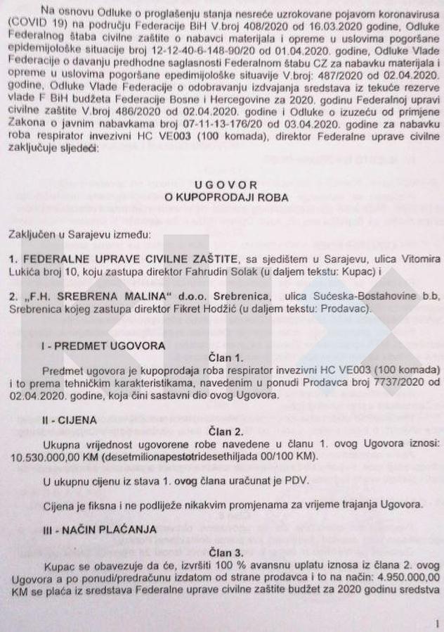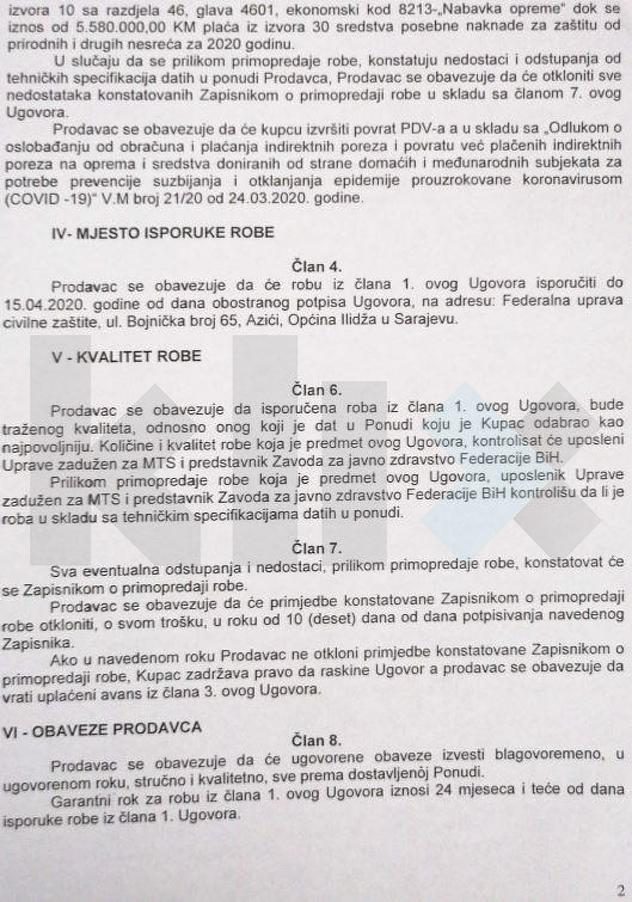 Zanimljivo je da se ugovorom Civilna zaštita obavezala da će cijeli ugovorni iznos stopostotno avansno uplatiti prodavcu i to da jedan dio plaća FUCZ iz sredstava predviđenih za nabavu robe, a drugi dio od sredstava za zaštitu od prirodnih i drugih nesreće.