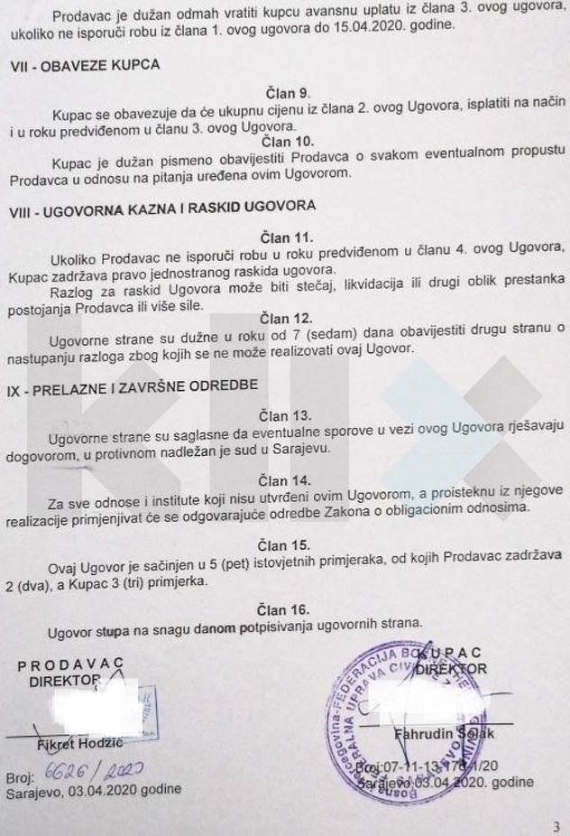 U Članu 4. precizira se da je obaveza prodavca da respiratore isporuči od 15. aprila te se može zaključiti da preuzeta obaveza nije izvršena na vrijeme. Kupac ima ugovorno mogućnost da zbog ovakvih propusta i raskine ugovor.